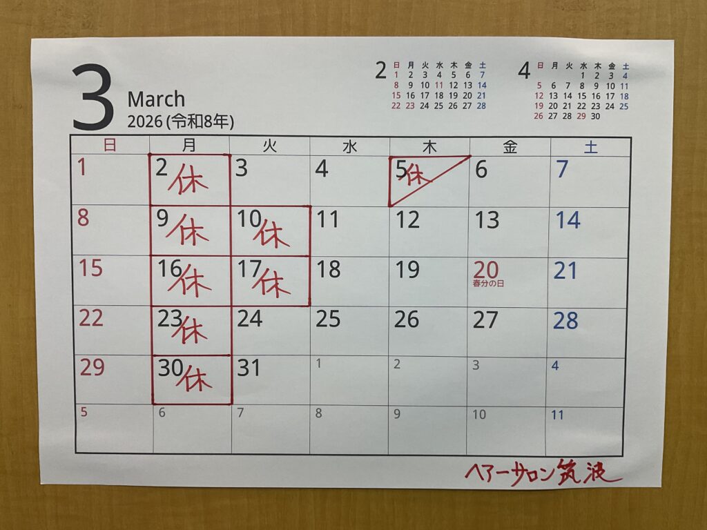 3月の定休日になります。